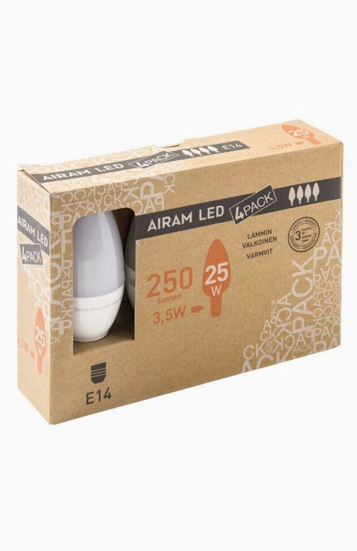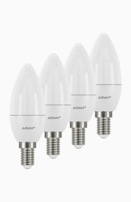Airam LEDlampa Kronljus E14, 3,5W 4-pack. LEDlampor från AIRAM i 4-pack. Dessa är kronljus och motsvarar traditionella kronljus-glödlampor med frostat glas. De har samma form och den lilla sockeln, E14.